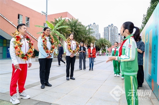当奚爱华、王娇、郭伟阳3位奥运冠军步入校园时,学生们瞬间沸腾,身着云南少数民族服饰的学生们夹道欢迎,学生代表为奥运冠军献上花环。随后,奥运冠军与师生共同驻足中国体育博物馆精心设计制作的“体育六艺展板”前,六位学生讲解员以生动鲜活的语言解读古代体育文化内涵。芳草小舞台上,灵动的民族舞蹈伴着欢快节奏上演,鲜明的地域风情瞬间点燃现场氛围。