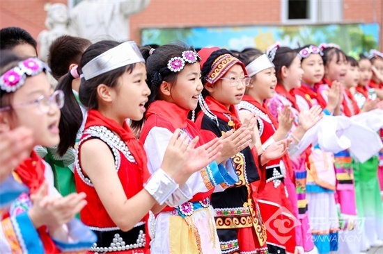 身着云南少数民族服饰的学生们欢迎奥运冠军